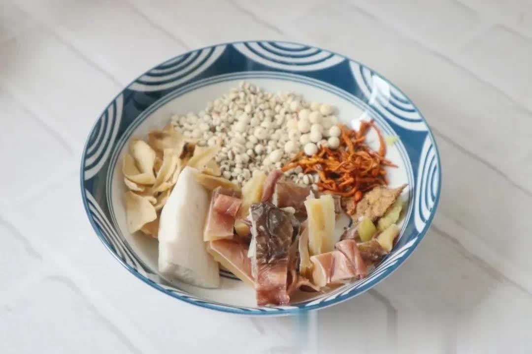 材料:排骨、墨鱼干、虫草花、百合和薏米、芡实、陈皮和姜各少许
