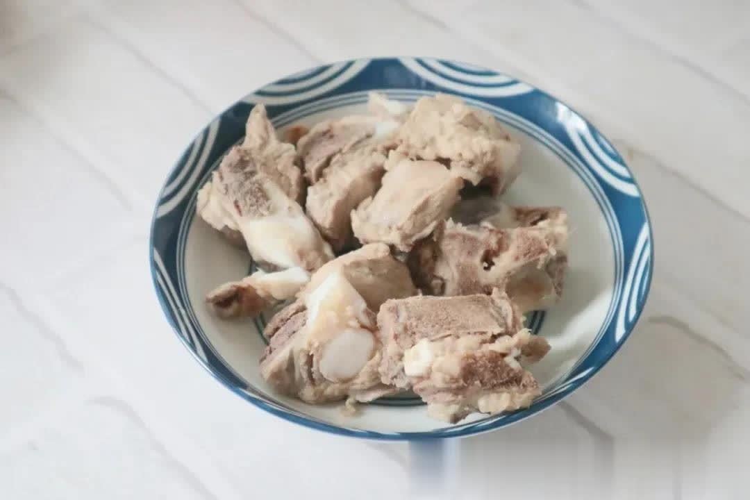 2、冷水锅中放入排骨,焯烫烧开捞出用温水冲洗干净。