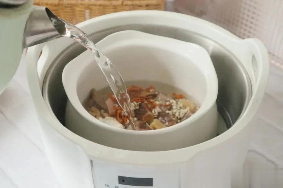 3、接着将所有材料都放入电炖盅,同时一次性要加够热水,盖上隔水炖,煲汤2个小时。
